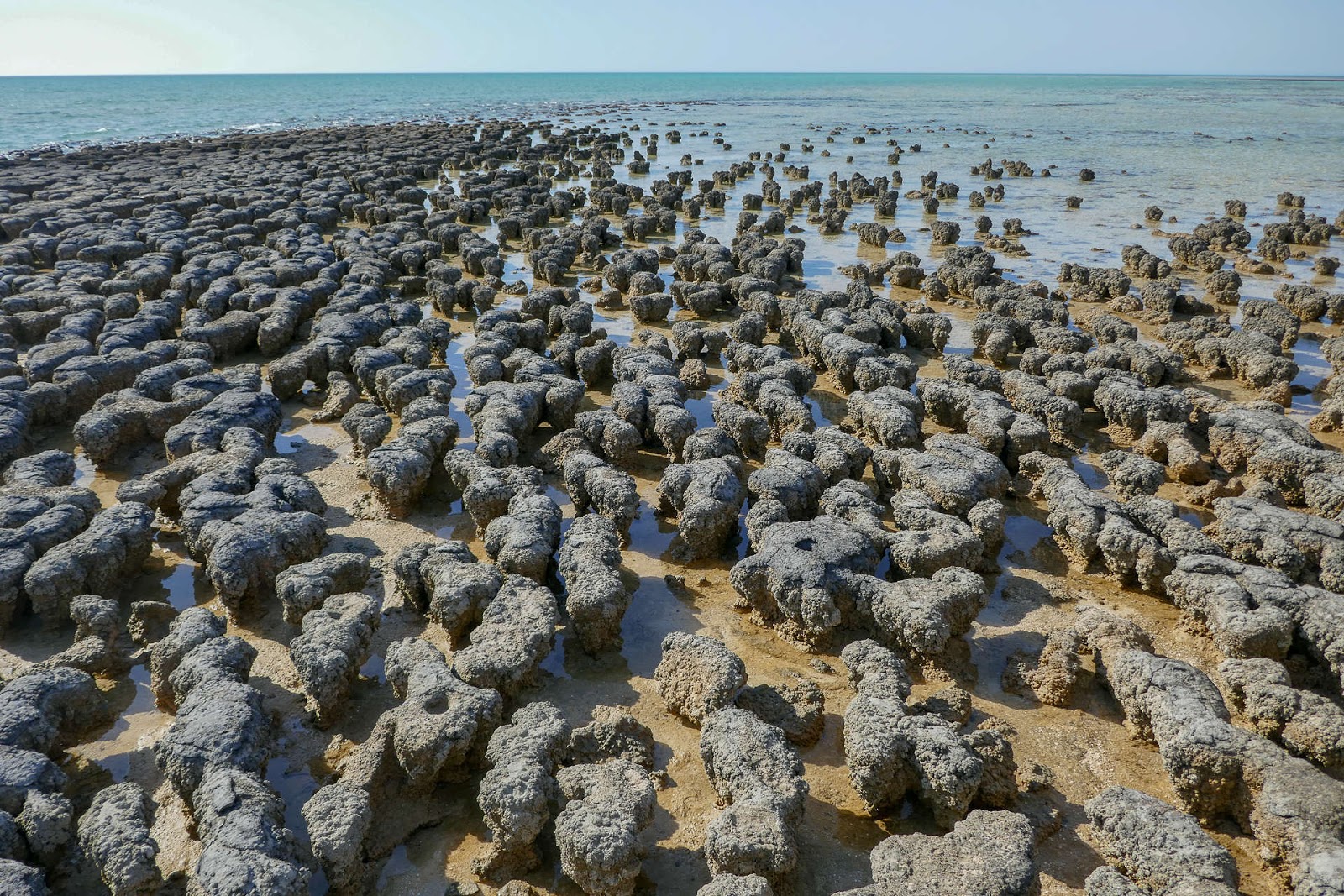 The last stop on our way to Denham was Hamlin Pool to see stromatolites. I had no idea what stromatolites were but they sure sounded interesting. We walked to a boardwalk built over the stromatolites which turned out to be microbial mats created by colonies of microbes called cyanobacteria (blue-green algae) which trap and bind sand and sediment grains. They didn’t look particularly attractive but they are remarkable for being found in the fossil record dating back 3.5 billion years and so are one of the earliest fossil evidence of life! What’s more, stromatolites are the reason life on this planet flourishes today. Before cyanobacteria, our atmosphere was only 1% oxygen. Then for the next 2 billion years, the photosynthesizing stromatolites pumped oxygen into the ocean. When the oceans’ waters were saturated, oxygen was released into the air. When the level reached 20% oxygen, life as we know it today, was able to exist and evolve!